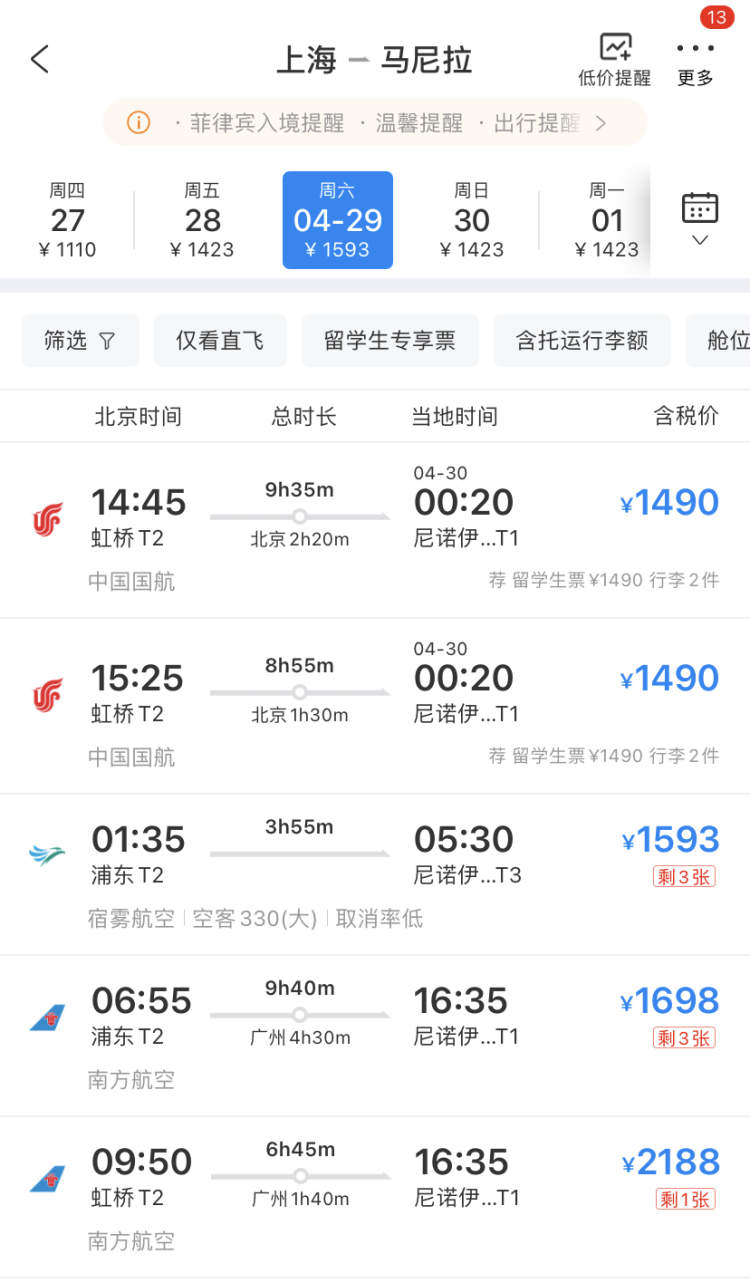 记者在旅行平台查询,4月29日从上海出发前往马尼拉的机票,大部分需要中转的航班价格在1500元左右,直飞航班当日最低价为1593元,不过余票仅剩3张。