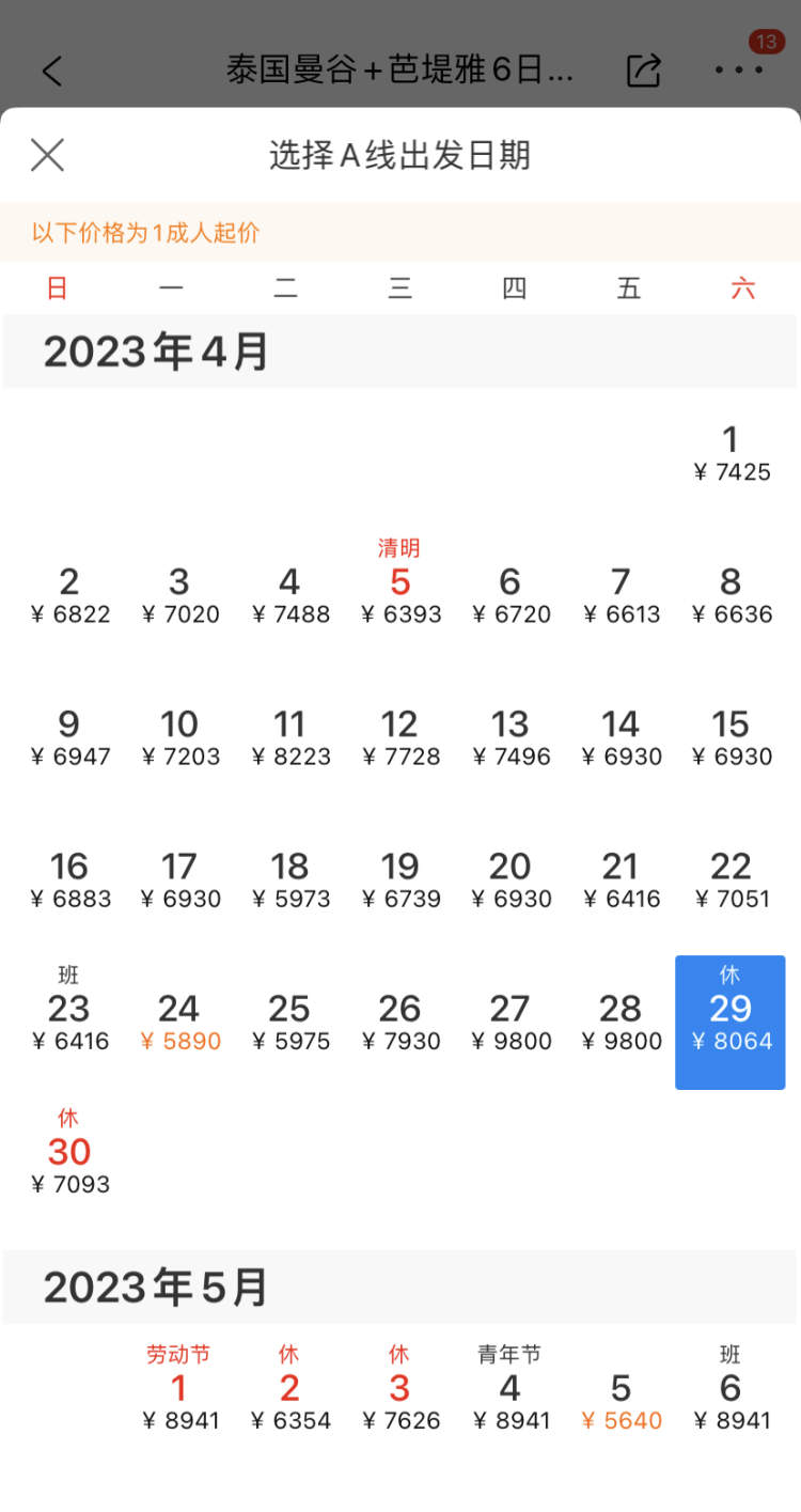 该平台的另外一款热门线路“泰国曼谷+芭提雅6日5晚半自助游”选择4月29日从上海出发价格为8064元/人起,而“五一”过后,选择5月5日出发,价格则回落至5640元/人。