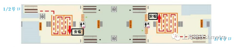 在1/2号口站厅、3/4号口站厅设置绕行通道,缓解进站速度。