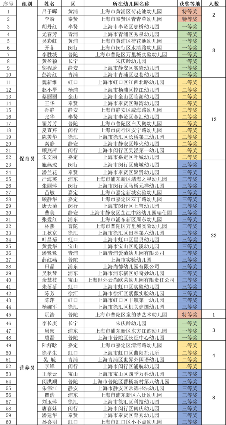 经过激烈的初赛角逐,首届上海市托幼行业职业技能大赛有212名保育员和营养员进入市级决赛,大赛决出特等奖3人,一等奖11人,二等奖16人,三等奖30人。大赛以赛促建、以赛促练,获奖选手还可根据人社部门的规定获得职业技能等级晋升。