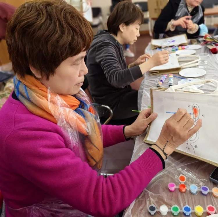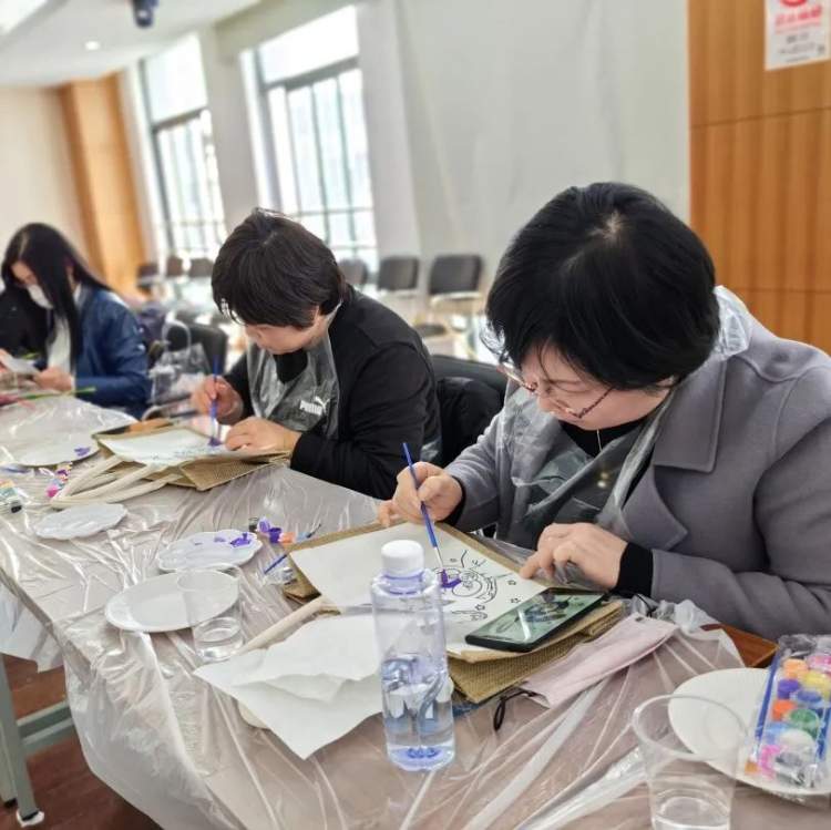 在包袋手绘DIY环节,大家认真聆听彩绘知识,学习彩绘技巧。在老师的专业指导下,拿起各种绘纸,发挥自己的巧手巧思,小心翼翼的剪裁和涂刷……通过对包袋的巧妙设计,“绘”出美丽,“袋”快乐回家。