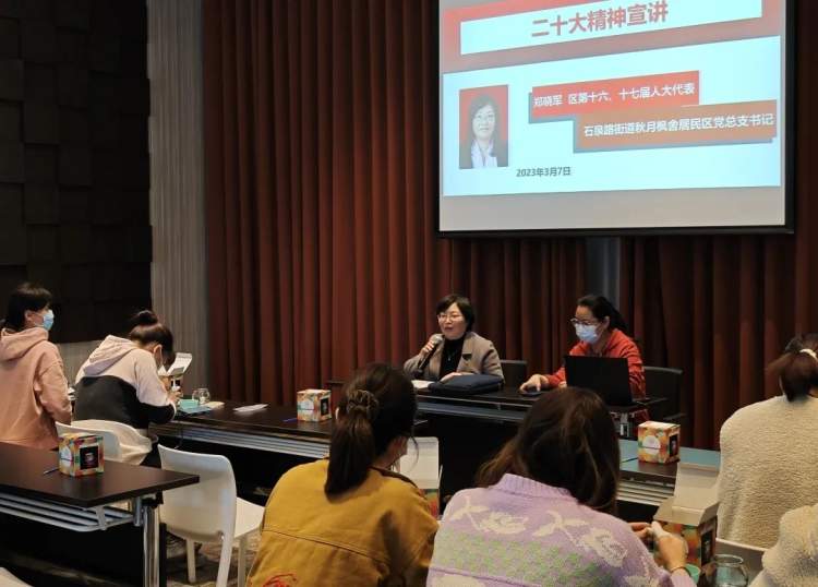 区第十六、十七届人大代表,石泉路街道秋月枫舍居民区党总支书记郑晓军分享了题为“学习贯彻党的二十大精神,努力开创社区党建新局面”主题讲座。