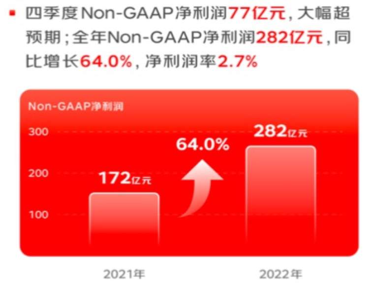 2022年,京东集团在非美国通用会计准则下归属于普通股股东的净利润达到282亿元人民币(约41亿美元),同比增长64%。