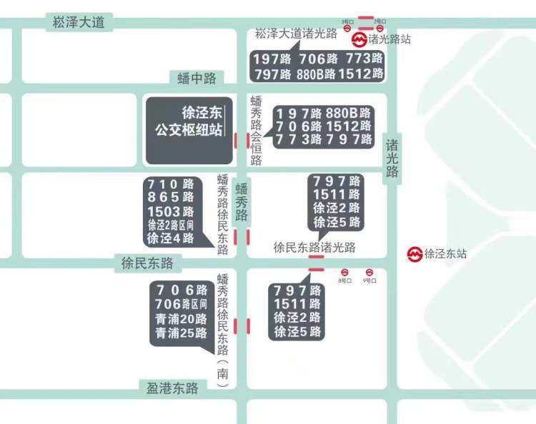 诸光路站施工期间公交上下客点疏解到蟠秀路、徐民东路和崧泽大道。