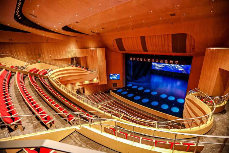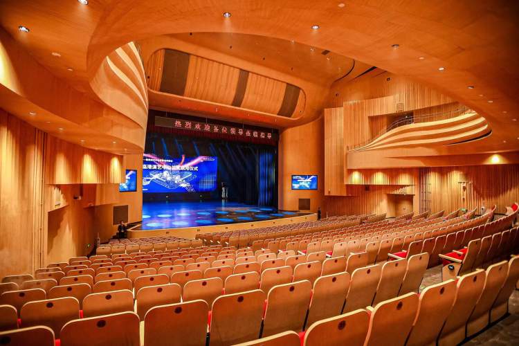 步入剧场,大厅被宛如五线谱起伏参差的优美线条一分为二,海浪一般的曲线把天花与墙面塑造成一个整体,与舞台上的演出交相呼应,打造出充满韵律感与艺术氛围的剧场空间。剧场的总体设计注重空间开放性和现代化,展现开放包容的形象,做到了艺术和智慧的充分相融,也生动传递了“融通世界的临港,恰到好处的生活”的理念。