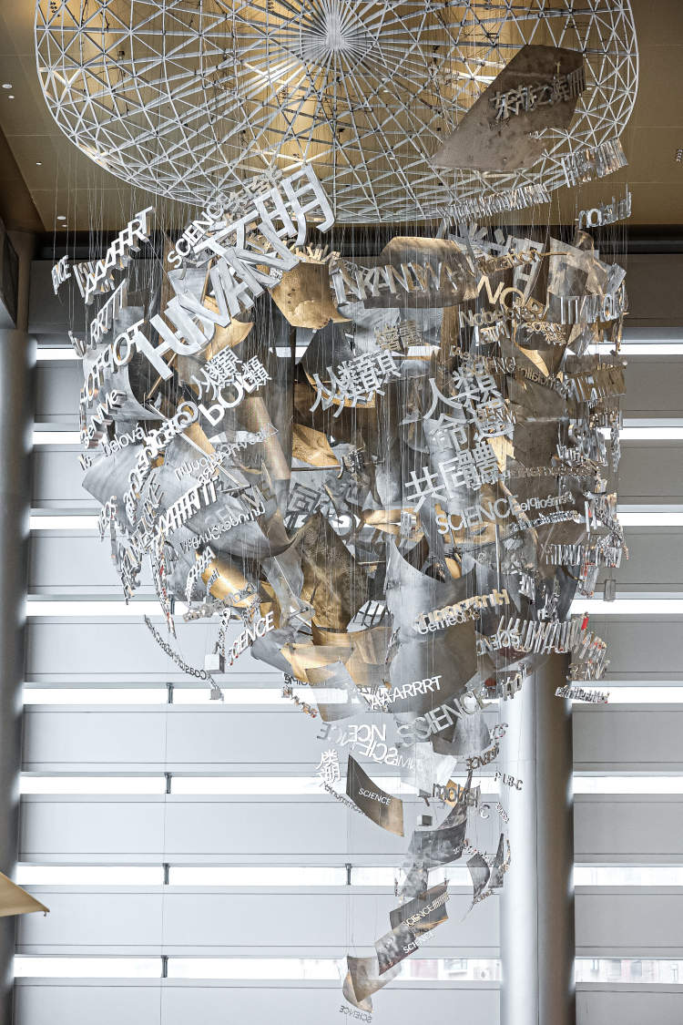 步入其间,一块被切割的“岩石”跃入眼帘,金属板模拟起伏的山峦与岩石,富有天然质感的陶板则像是光洁的玉石,营造出丰富的层次感。缕缕阳光映射下,外挂的连廊逐渐展露内部闪闪发光的美玉,也寓意着科学技术在临港得以沟通交流,彰显新时代中国坚持“全方位”的鲜明态度和向全世界扩散着的影响力。