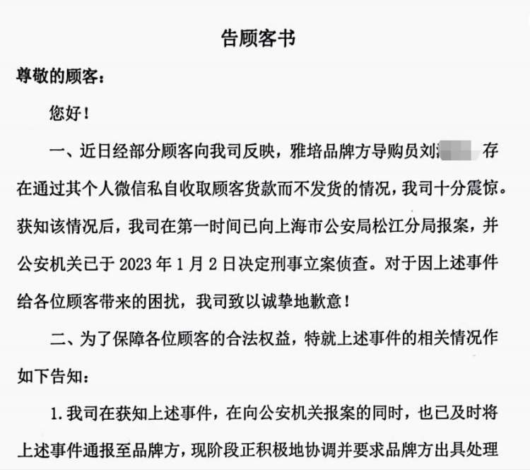 该告知书强调,刘女士系雅培品牌方导购员,存在通过其个人微信私自收取顾客货款而不发货的情况。获知该情况后,孩子王门店在第一时间已向上海市公安局松江分局报案,并公安机关已于2023年1月2 日决定刑事立案侦查。在向公安机关报案的同时,门店也已及时将上述事件通报至品牌方,并与刘女士的用人单位和用工单位沟通,要求他们尽快出具方案解决问题。