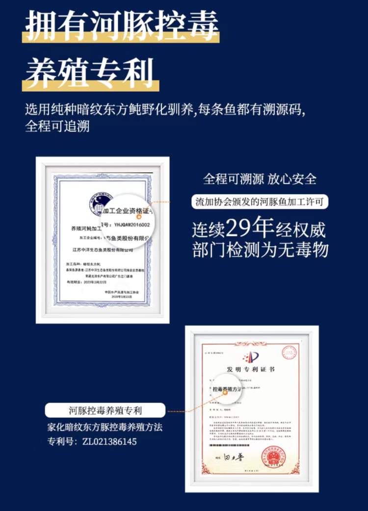 资料显示,中洋经过几十年的发展,已建成了规模庞大的河豚鱼养殖基地、首批国家级水产健康养殖和生态养殖示范区,中洋“南通长江河豚”成为国家地理标志保护产品、国家农业农村部审核批准的暗纹东方鲀养殖鱼源基地加工企业,中洋河豚市场覆盖超过70%,品牌价值80亿元。