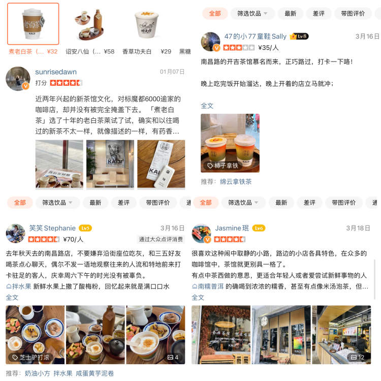 “平台上,开吉茶馆的热度一路走高。”美团的一个相关人士透露,2月份大众点评上的搜索热度环比1月增长160%,其中,南昌路首店的搜索量环比增长277%,“很多人会定向搜索‘开吉茶馆’,不少人真是专门跑到那里打卡的。”