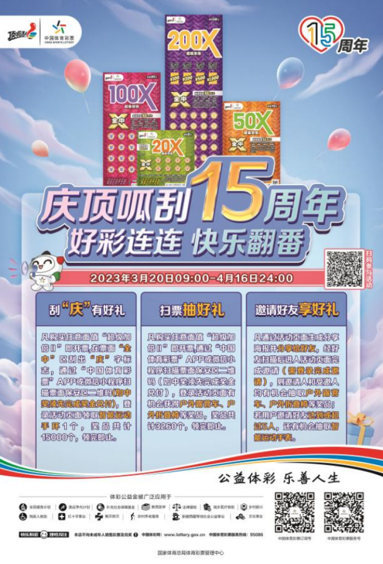 十五年喜悦,十五年梦想。在喜迎顶呱刮上市15周年之际,为回馈广大购彩者长期以来对顶呱刮的支持,3月20日至4月16日期间,顶呱刮新票“超级加倍Ⅱ”携惊喜好礼火热来袭。