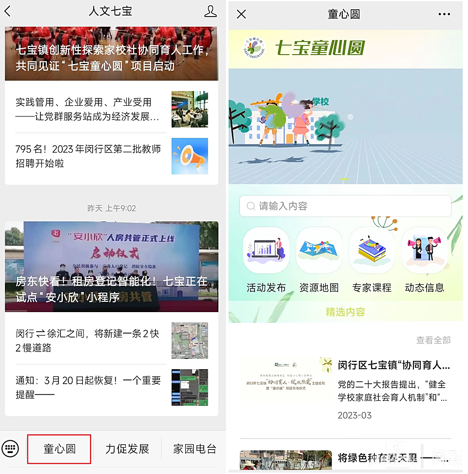 承载着资源聚合和互动服务功能的“七宝童心圆”协同育人数字平台也在“人文七宝”官方公众号上线。家长、学校、社区可通过该平台了解到“七宝童心圆”家校社协同育人项目活动的最新信息;了解专家顾问团成员信息和课程信息、“七宝童心圆”系列主题活动和比赛的报名通道以及风采展示和特色案例分享等。家校社协同育人工作还将通过主题论坛、系列主题活动、项目推进行事历、年终总结和成果展示、研究成果出版和发布等形式不断推进。