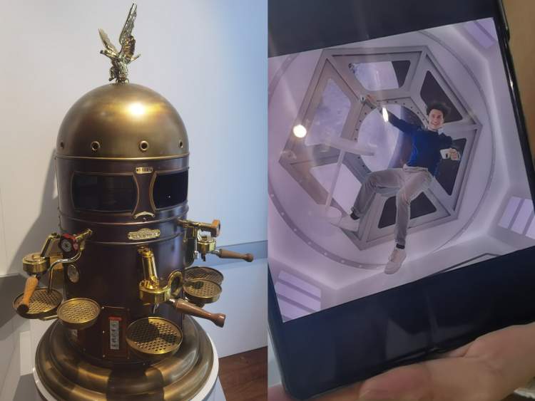 徐阿婆依次参观了展览的五个独立空间,欣赏了由经典咖啡杯和咖啡豆塑造的艺术装置,看到了1884年全球限量70台的古董咖啡机,以及“太空喝咖啡”的趣味拍照打卡点。Lavazza在2015年将第一台太空浓缩咖啡机送上太空,而在这个展厅,参观者可以感受咖啡“从古董到太空”的奇妙时空穿越。