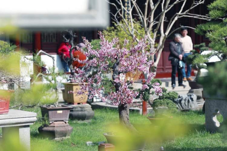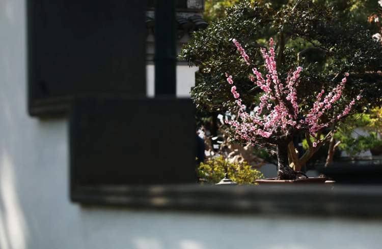 在上海古猗园,盆景园内盛开的美人梅鲜艳又明媚,枝条上绽放着粉红色的花朵,花瓣如同云霞,默默地散发出阵阵清香,不似梅香般清甜,更有一种恬淡的气质,小鸟、蜜蜂飞舞其间,展现着春之色彩。