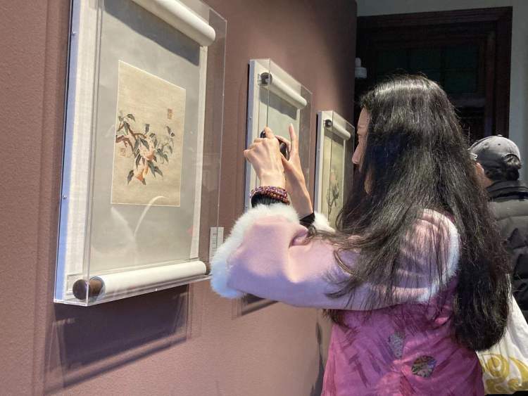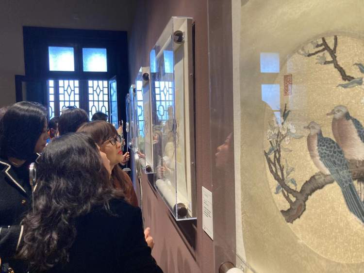 林玲透露,古代绘画题材的缂丝作品中,最难的是书法和山水,书法中的笔触和山的皴法以及叶子的动势,都对缂丝工匠的技艺提出了巨大的挑战,大家不妨在参观时用放大镜给与重点关注。