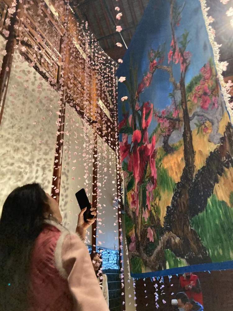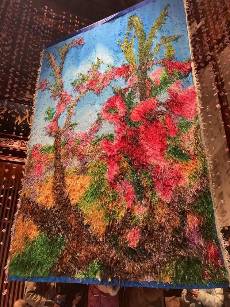 在吴昌硕纪念馆展厅中,一件宽2米、高2.8米的缂丝桃花作品悬挂于空中,气势惊人。这件《周春芽缂丝桃花浅深处》,源自艺术家周春芽著名的桃花油画。缂丝作品以背面示人,故意留出数以十万计的线头,远远望去宛如一幅抽象画。而它的正面,由上千种颜色构成的画面既有油画的酣畅淋漓感,又有纺织品的肌理质感。该作品由3位缂丝工匠花了3年时间制成,仅一个桃红色,就有17个色阶。