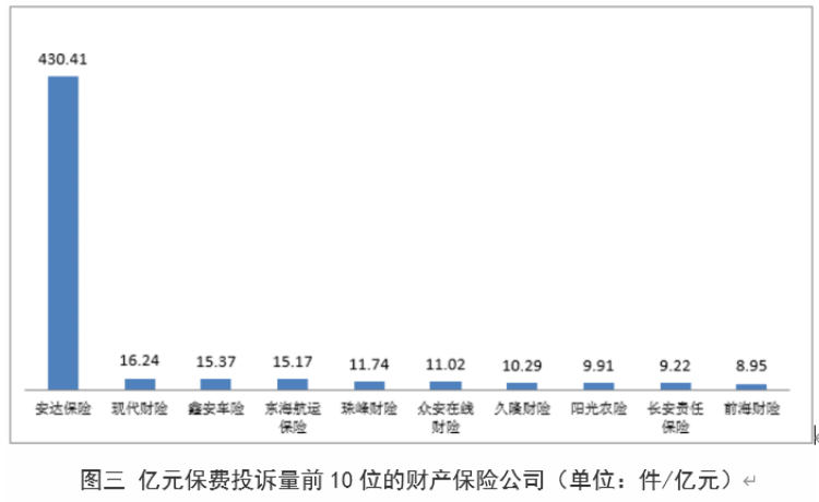 而同期财产保险公司,亿元保费投诉量中位数为3.69件/亿元。其中,亿元保费投诉量居前10位的为:安达保险430.41件/亿元;现代财险16.24件/亿元;鑫安车险15.37件/亿元;东海航运保险15.17件/亿元;珠峰财险11.74件/亿元;众安在线财险11.02件/亿元;久隆财险10.29件/亿元;阳光农险9.91件/亿元;长安责任保险9.22件/亿元;前海财险8.95件/亿元。