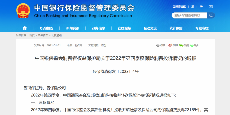 来自中国银保监会官网的信息显示,就在3月21日,中国银保监会消费者权益保护局发布《关于2022年第四季度保险消费投诉情况的通报》,通报了中国银保监会及其派出机构接收并转送的银行业保险业消费投诉情况。