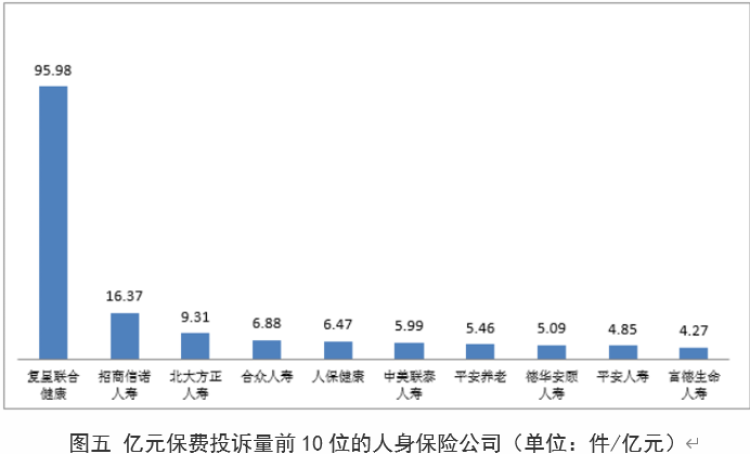 而在亿元保费投诉量中,复兴联合健康、安达保险分列人身保险、财产保险公司投诉量第一位。