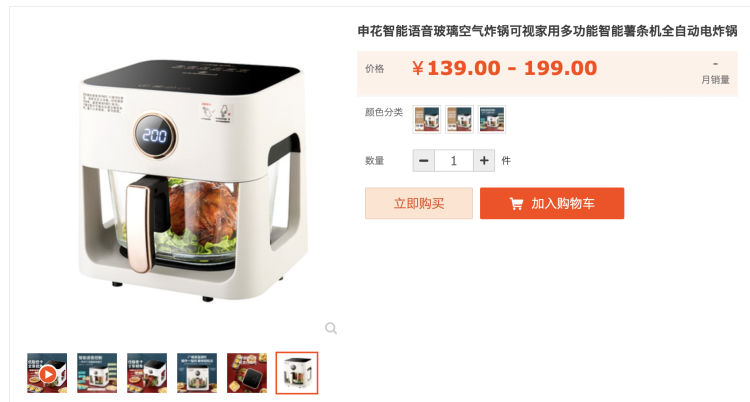 记者打开曹先生提供的淘宝店链接,页面上对这款空气炸锅的介绍是:“申花智能语音玻璃空气炸锅可视家用多功能智能薯条全自动电炸锅”。