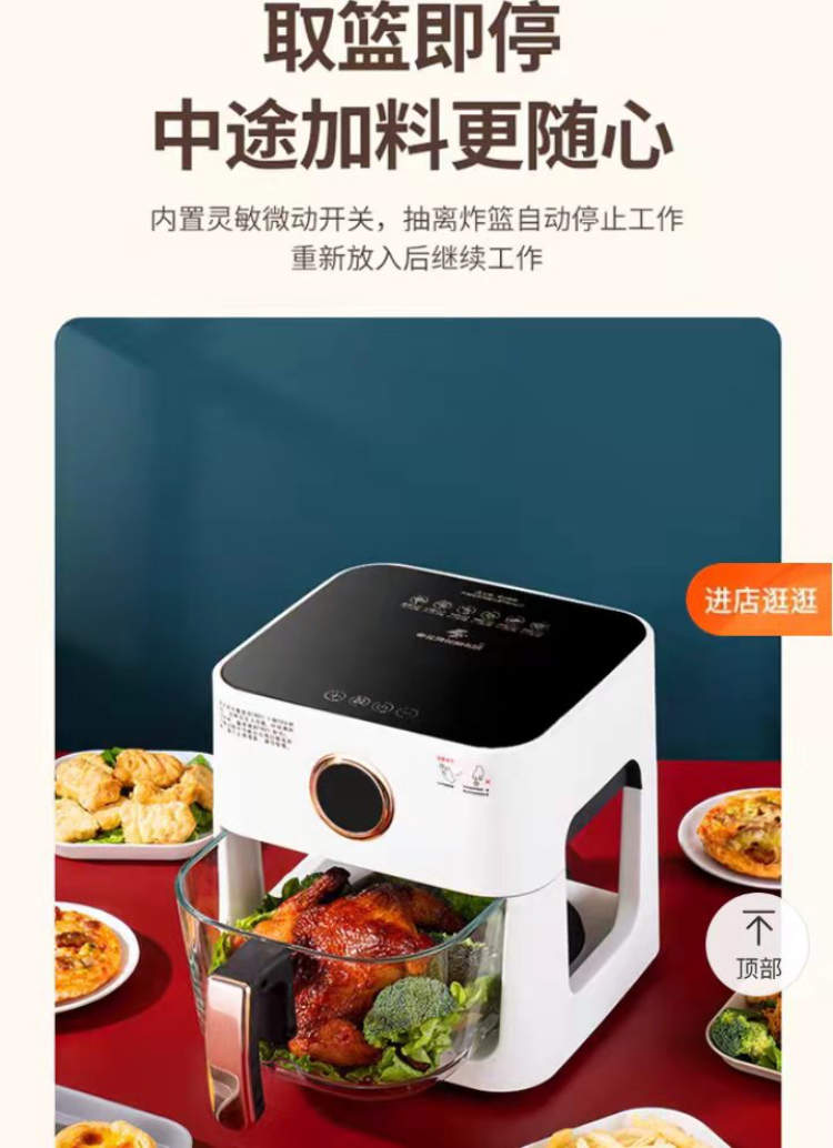 买我们上海的品牌也是图个放心。而且这款空气炸锅外壳是透明的,商家宣传说‘取篮即停’,能够很好地保证老人和孩子操作时的安全,我就下单了。”