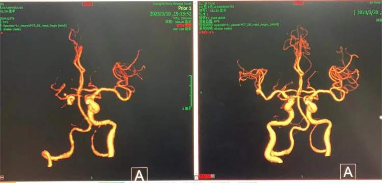 (术前、术后患者的脑部血管CTA成像)