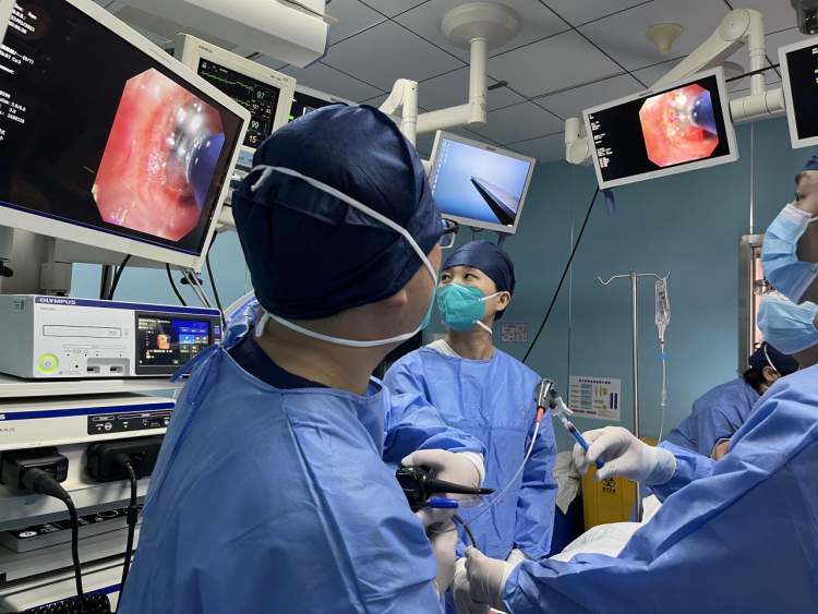 术中,在麻醉科主任吴镜湘团队的保驾护航下,孙加源主任通过可弯曲的支气管镜通道,置入热蒸汽导管,一步步推进到目标位置。待导管前端的球囊充气固定后,团队按照治疗方案输入治疗剂量,开始释放热蒸汽,释放时间为7.7s,操作很成功!