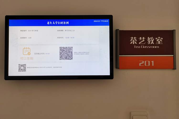 记者昨日走访上海老年大学时发现,南塘浜路校区的每间教室门口都设置有电子班牌。学员进教室前需要扫描电子班牌上的二维码签到。此外,每间教室均配备直播设备和大屏。
