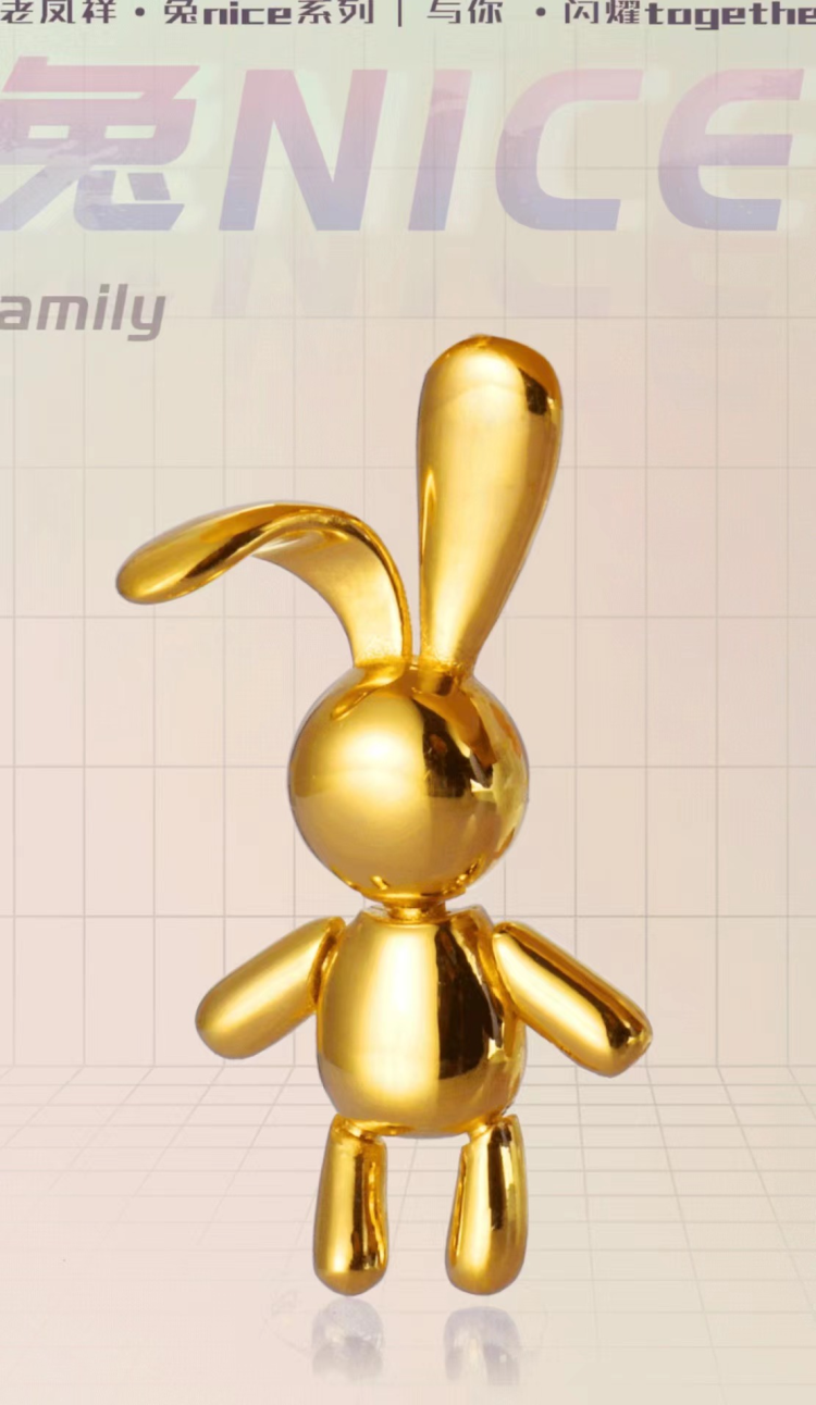 在今年兔年之际,老凤祥推出的《兔NICE》,以兔子为设计原型,结合潮流造型与机械元素,用简洁的线条勾勒出多样化的炫酷兔子形态,传递着爱与快乐,治愈每个努力生活的人。闪耀黄金兔以潮玩和生肖的融合,打破了传统刻板印象,体现了中西文化兼容。