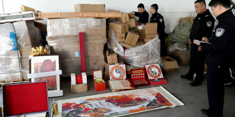 如一尊所谓“皇家珍宝九龙玉玺”系赝品,一副金丝彩绘版画“千里江山图”系临摹品,由画手绘制,成本价仅100到200元不等。