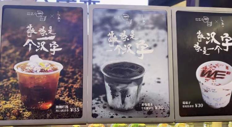 有一家咖啡馆已经正式对外营业,目前有三款《敬你是个汉字》系列特调咖啡:微醺烂漫、来电墨水、莓莓子。