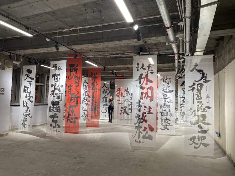 此前就在社交平台上看到有人打卡这场展览,有观众评价“工地里办书法展,不愧是朱老师”、“又酷又硬核”……对于在整层毛坯空间里办展,朱敬一告诉记者:感觉很爽,没有什么压力与限制。
