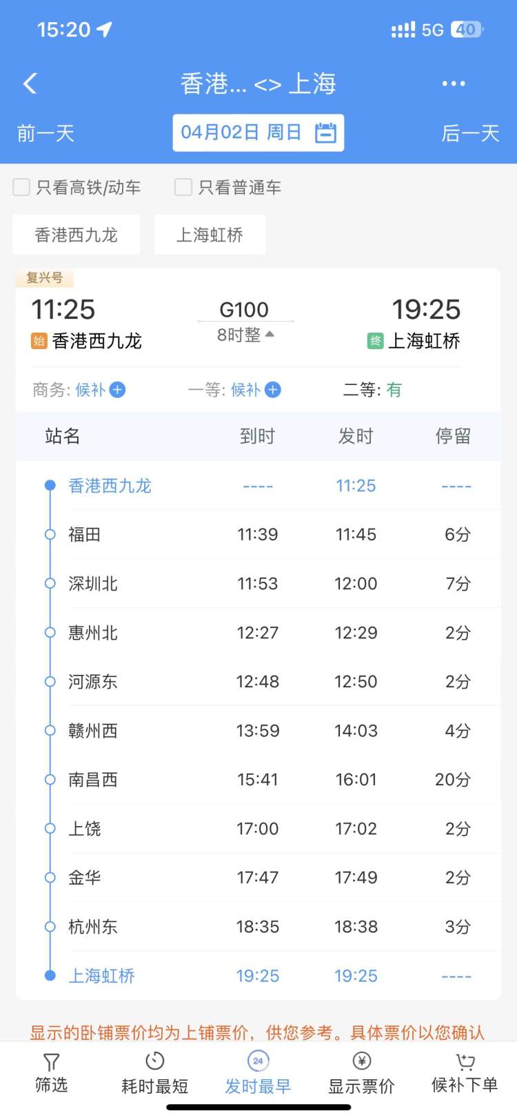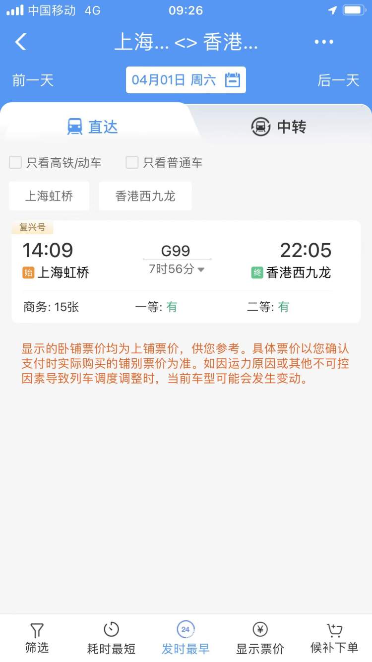 从香港至上海的高铁票似乎更受欢迎。今天下午3点20分左右,12306显示,4月2日从香港西九龙至上海虹桥的G100次列车,商务座和一等座都已经售罄处于“候补”状态,二等座还有票。