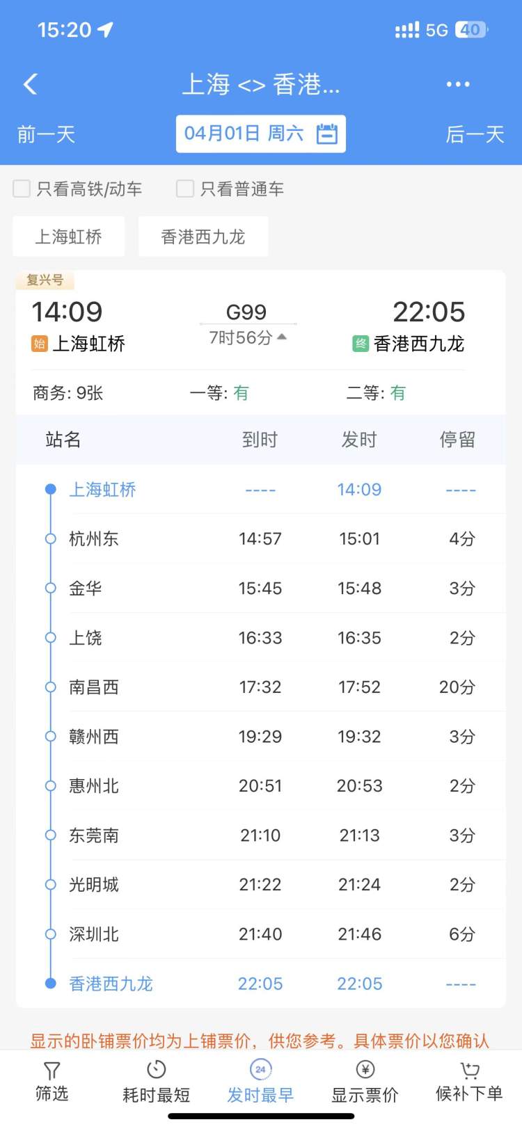 4月2日,香港至上海的高铁售票情况,商务座和一等座“候补”。