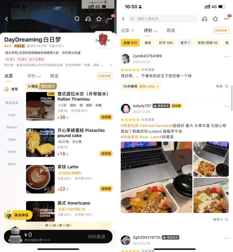 Daydreaming by Monos开店至今除了受疫情影响,还经历过道路施工、房屋改造等工程,对线下经营影响较大,好在门店通过线上外卖渠道获得了更多的曝光机会,杨先生说,逐步推动线上业务适配后,咖啡馆实现了更广泛的客群抵达,也实现了线上向线下的导流。