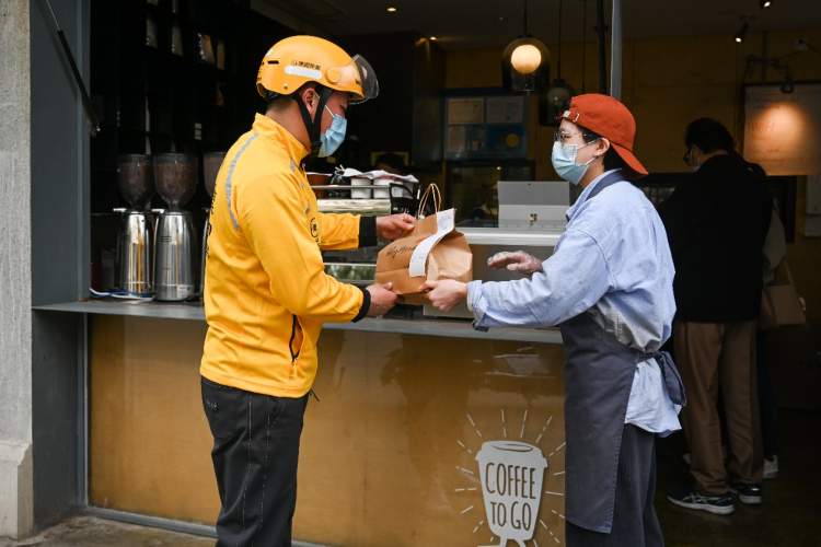 ■店员将刚做好的外卖咖啡交给前来取餐的骑手。朱伟/摄