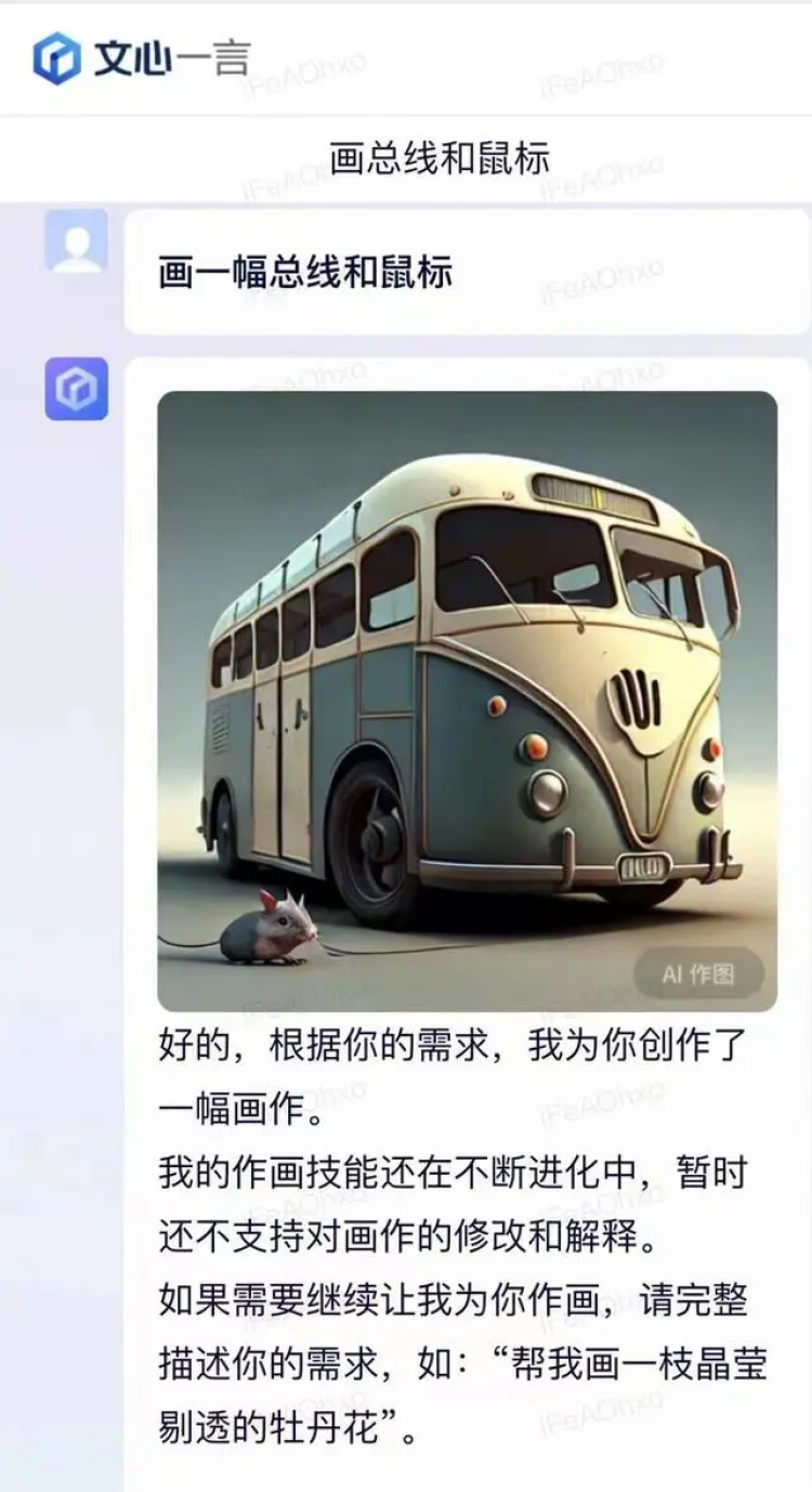 早前,上述博主尝试让文心一言画了许多会产生“中英歧义”词组短语。他发现,输入“鼠标和总线”,文心一言会自动生成“老鼠和公共汽车”。该博主认为,这是由于“鼠标”和“总线”的英文是“mouse”和“bus”,文心一言显然对输入的中文进行了机器翻译。