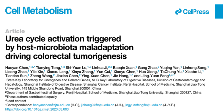 近日,上海交通大学医学院附属仁济医院消化科房静远教授团队在著名学术期刊《细胞·代谢》(影响因子IF=31.373)在线发表重要研究成果,首次揭示了肠道菌群能够介导宿主尿素循环代谢途径,与宿主形成免疫-微生物代谢轴,进而调节宿主免疫代谢与功能,影响结直肠癌的发生。这一研究成果为干预结直肠腺瘤-腺癌进程提供了潜在的诊断、预警及治疗靶点。