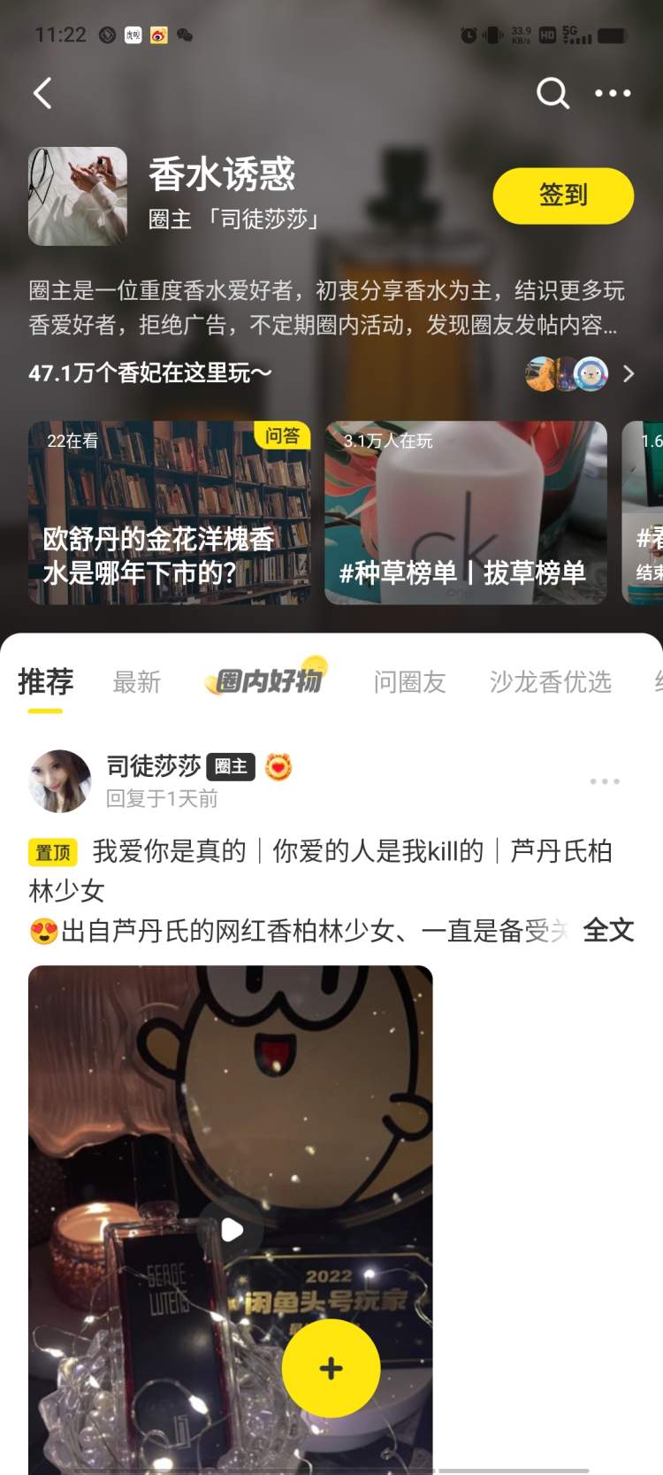 在闲鱼平台,司徒莎莎吸引了20多万粉丝,她创建的“香水诱惑”圈子,也有了近50万的圈友。大到香水的制作区别,小到香水如何使用,这些圈友们总是乐此不疲的讨论。