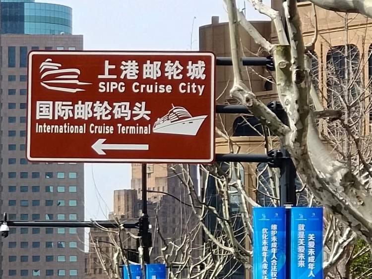 “上海邮轮城”和“国际邮轮码头”指示牌