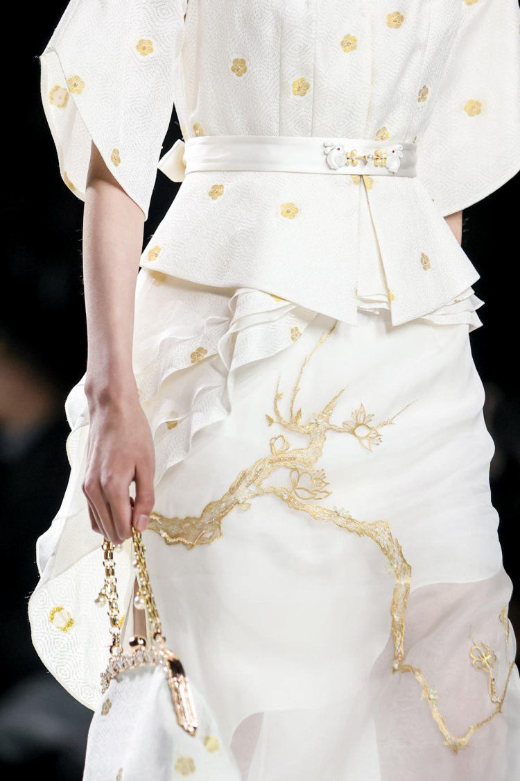 非遗苏绣、盘扣等传统元素被融合进压褶、烫金的西式服装设计剪裁中。这个来自苏州的本土高定品牌在今年的上海时装周中,用属于自己的表达方式,带来了十年一次的品牌大考。