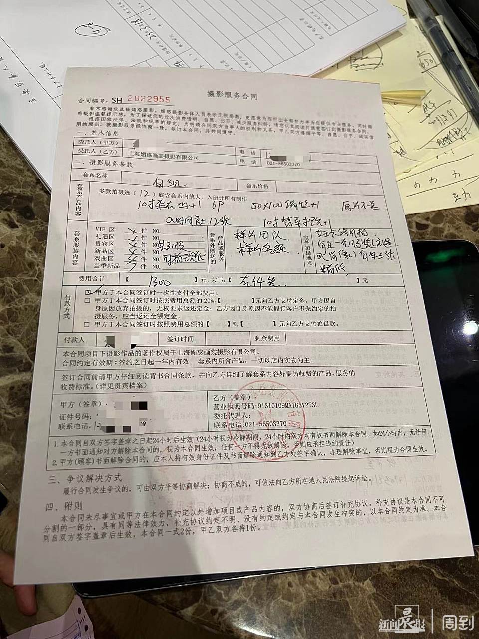 张女士告诉记者,经过一个多小时的“推销轰炸”,她最后花1300元买了一份套餐,并约定于约一个月后拍摄。“销售让我付完全款,才和我签合同,合同签了,他们立马就送客了。”
