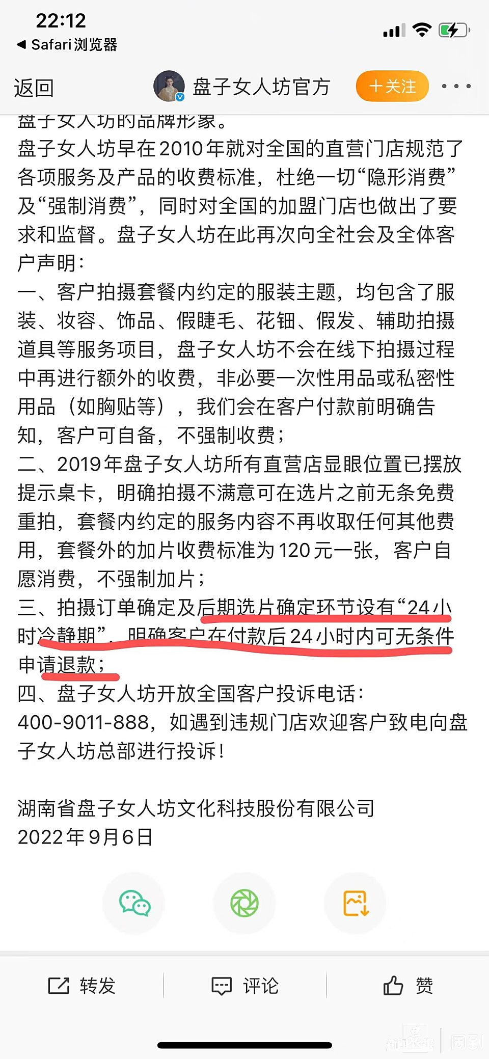 2022年9月6日,“盘子女人坊官方”微博号更是发文表示:“拍摄订单及后期选片确定环节设有‘24小时冷静期’,明确客户在付款后24小时内可无条件申请退款。”