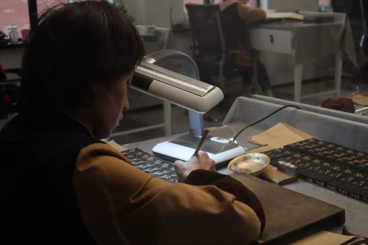 制墨从原料配制到成型装饰,一般要经过点烟、和料、制作、翻晾、描金等数道大工序,夏飞主要负责的就是制作的环节。