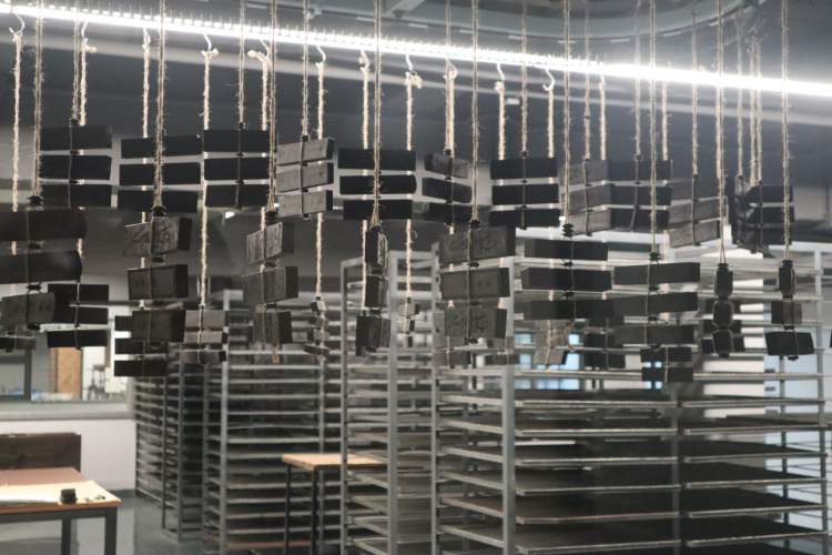 当记者以为到这里就大功告成时,夏飞却说,这才是完成了定型,接下来的翻晾阶段才是决定一块墨成功与否的关键,这对空气中的温度和湿度有很高的要求: