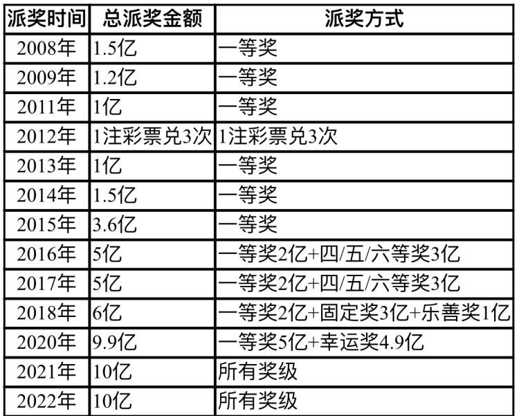从派奖金额来看,可谓是一路升高,节节开花。2008至2014年,派奖金额基本在2亿元以内;2015年实现突破,派奖金额上涨至3.6亿元;2016至2017年,派奖金额均为5亿元;2018年因“乐善奖”的加入上调至6亿元;2020年则大幅上调至9.9亿元;2021年、2022年,大乐透派奖金额持续突破,达到10亿元,力度空前,且2022年派奖还新增了15周年特别奖。
