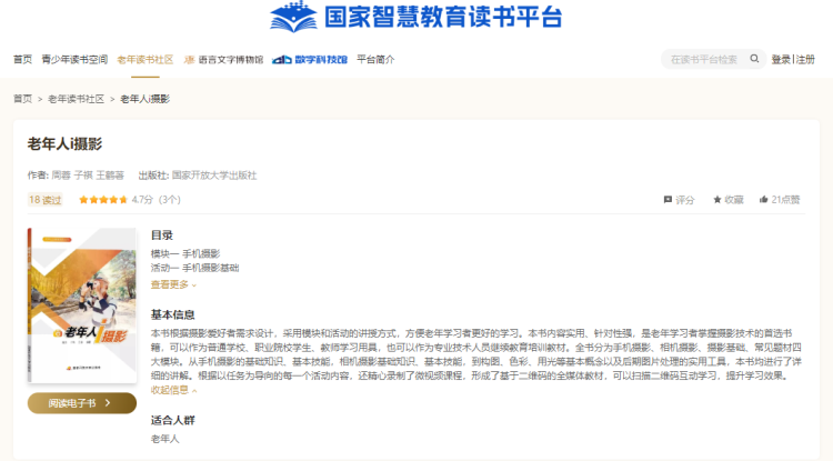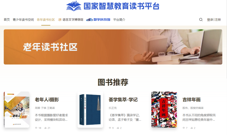 其中老年读书社区提供贴近老年人精神文化需求的优秀读书资源,如《老年人i摄影》、《荟学集萃-学记》、《吉祥年画》、《京剧》、《民间美术之旅》等作品,努力为实现老有所学、老有所乐、老有所为创造更好条件。