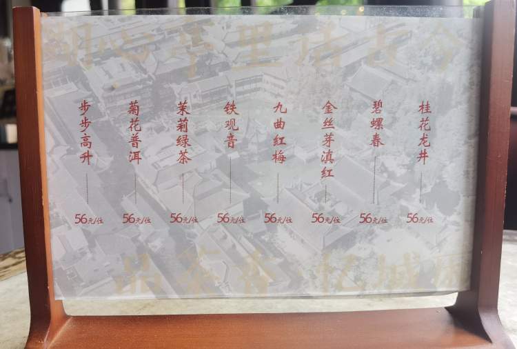 桂花龙井、碧螺春、金丝芽滇红、九曲红梅……一楼的八种茶56元/位,但赶早的阿姨爷叔们都知道,早场七点半到下午一点半打对折,只要28元,就能在风景绝美的九曲桥畔的古色古香老茶楼坐上小半天。