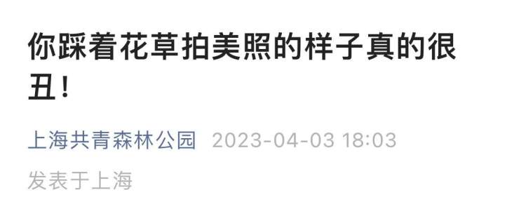不料,悲剧还是发生了。看到花草刚亮相即被踩踏的“惨状”,园方痛心不已,在公园微信公众号以“你踩着花草拍美照的样子真的很丑”为题,发布了花草被踩踏后的照片,呼吁公众文明游园,文明赏花。