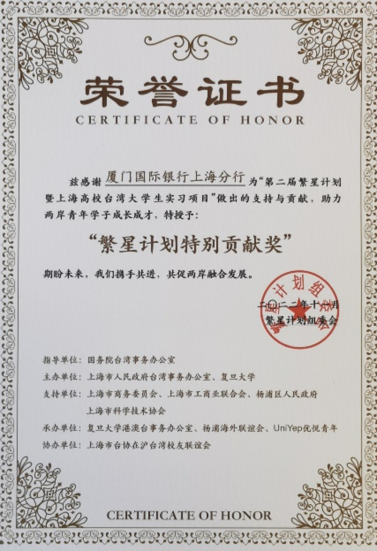 由复旦大学主办,上海市台办指导的“繁星计划及两岸高校大学生背景提升训练营活动”于2021年首次开展,旨在搭建大陆与台湾青年学子学习交流、能力提升的平台,迄今已连续举办两年。截至2022年,“繁星计划”(上海高校台湾大学生暑期实习项目)已吸引来自全国22个城市,55所高校的259名台湾学生报名参与。与“繁星计划”相结合开展的两岸高校大学生背景提升训练营,目前已成功举办6期、共邀请到57位大咖导师倾情分享,覆盖500多所高校,10万多名青年学子因此受益。2022年11月,厦门国际银行上海分行积极参与“繁星计划”,荣获第二届“繁星计划”特别贡献奖。