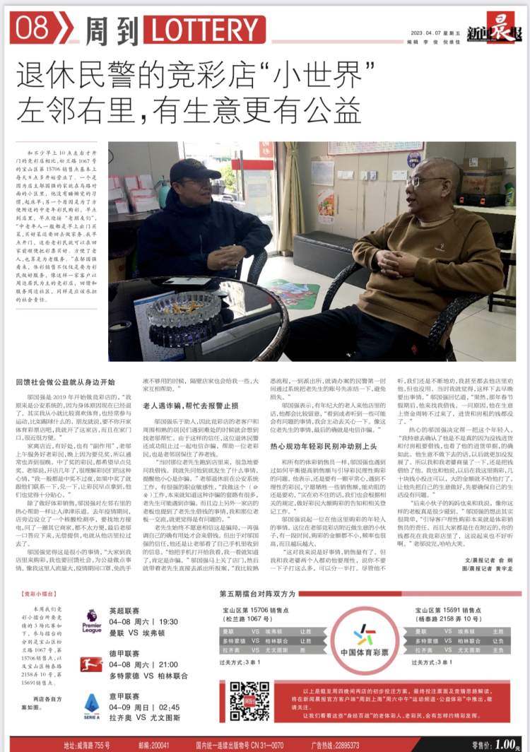 和不少早上10点左右才开门的竞彩店相比,松兰路1067号的宝山区第15706销售点基本上每天8点多开始营业了。一个是因为店主邬国强的家就在马路对面的小区里,他没有睡懒觉的习惯,起床早;另一个原因是为了方便附近的中老年彩民购彩,早点到店里,早点迎接“老朋友们”,“中老年人一般都是早上出门买菜,买好菜还要回去做家务。我早点开门,这些老彩民就可以在回家前顺便把彩票买好。方便了老人,也算是为老服务。”在邬国强看来,体彩销售不仅仅是要为彩民做好服务,像这样一家客户以周边居民为主的竞彩店,回馈和服务周边社区,同样是应该承担的社会责任。